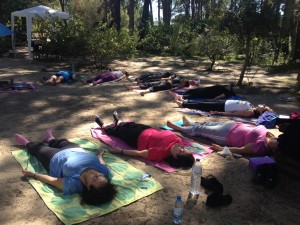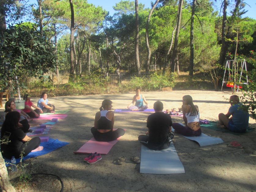 Durante a manhã, fizemos uma prática de Yoga Integral em plena natureza. Onde ninguém ficou indiferente aos encantos da mãe natureza que nos presenteou com um céu azul celestial por trás do verde das copas das árvores, uma temperatura perfeita num misto de conforto e suavidade, a brisa suave que se fazia sentir com o doce cheiro a campo harmonizando todo o nosso Ser, os pés na areia,…